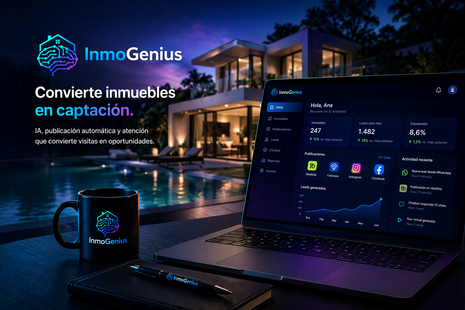 InmoGenius no te vende piezas separadas. Conecta la interpretación del inmueble, la generación de contenido, la distribución automática y la atención al lead para crear una red de captación mucho más grande a partir de una sola carga.